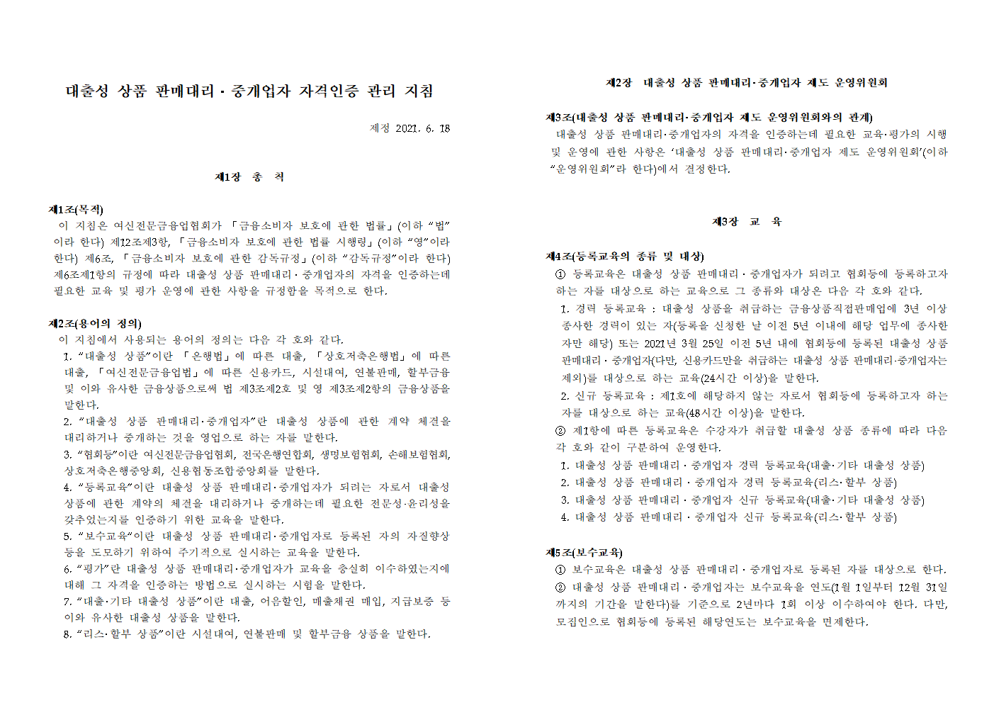 여신전문금융업협회가 「금융소비자 보호에 관한 법률」(이하 “법”이라 한다) 제12조제3항, 「금융소비자 보호에 관한 법률 시행령」(이하 “영”이라 한다) 제6조, 「금융소비자 보호에 관한 감독규정」(이하 “감독규정”이라 한다) 제6조제1항의 규정에 따라 대출성 상품 판매대리․ 중개업자의 자격을 인증하는데 필요한 교육 및 평가 운영에 관한 사항을 규정함을 목적으로 한다.