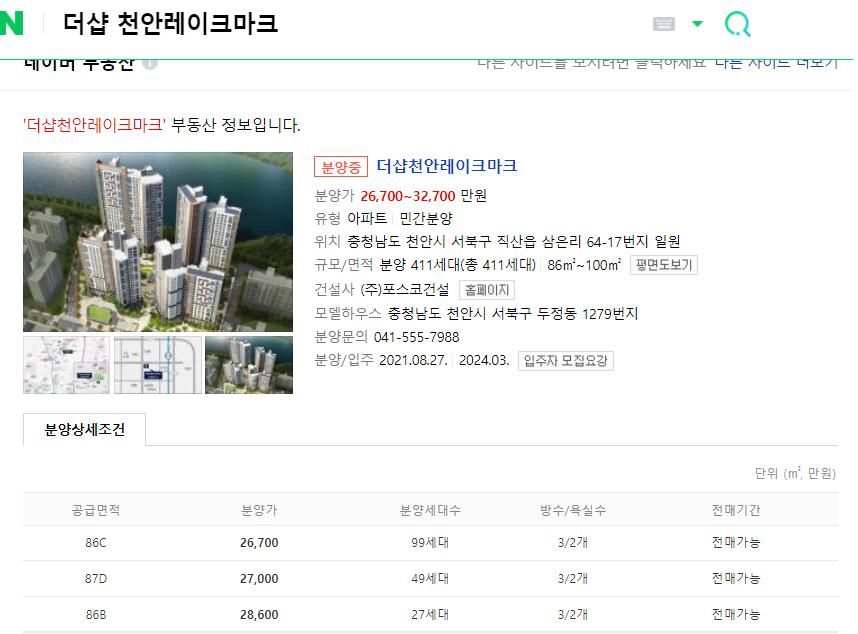 더샵 천안레이크마크 분양가 매매가 프리미엄