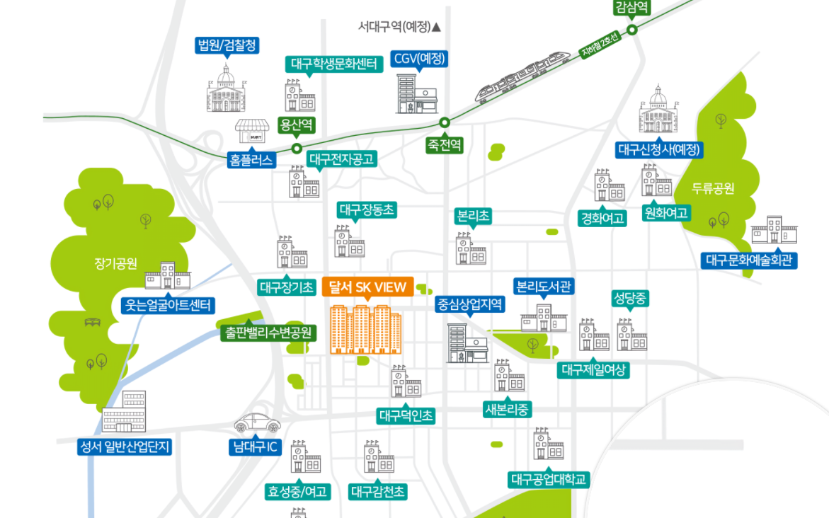 달서 SK VIEW는 출판밸리수변공원, 두류공월, 본리 공원등 자연 환경을 일상에서 누릴 수 있습니다. 대구 달서구의 개발 계획으로 인해 서대구역이 예정되어 있고 대구 신청사도 이전 예정입니다. 롯데백화점 상인점, CGV 대구월성점등 본리도서관 법원 검찰청등 다양한 문화 활동을 가깝게 이용하 실 수 있습니다.