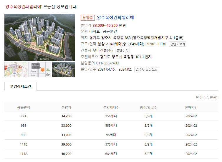 양주 옥정 린 파밀리에 분양가와 청약