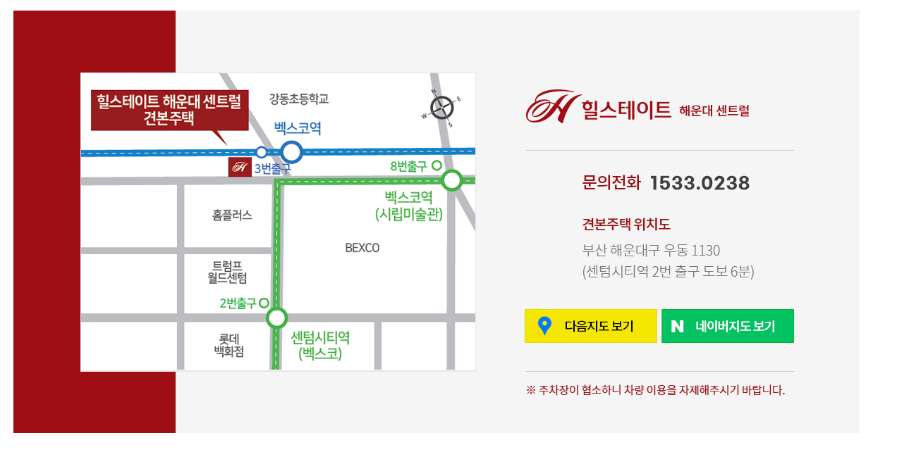 힐스테이트 해운대 센트럴 견본주택 주소는 부산광역시 해운대구 우동 1130 입니다. 센텀시티역 2번 출구에서 도보로 6분 거리에 위치하고 있습니다. 현대엔지니어링이 해운대구에 힐스테이트 해운대 센트럴를 생활숙박시설로 최고 41층 239실을 공급합니다. 자세한 사항은 센텀시티역 힐스테이트 해운대 센트럴 견본주택에서 확인해보실 수 있습니다.