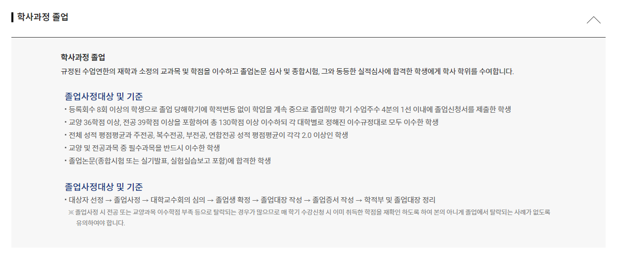 ※ 졸업사정 시 전공 또는 교양과목 이수학점 부족 등으로 탈락되는 경우가 많으므로 매 학기 수강신청 시 이미 취득한 학점을 재확인 하도록 하여 본의 아니게 졸업에서 탈락되는 사례가 없도록