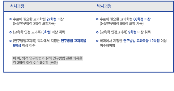 석사, 박사 과정은 논문 작성을 해야 하는데, 논문과 관련된 필수 과목또는 종합 시험이 있습니다. 이에 학교 규정을 잘 확인하여 졸업을 위한 시험과목, 외국어 또는 종합시험과 논문 심사를 위한 과정을 잘 준비해야합니다.