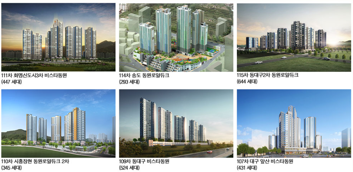동원 개발의 비스타 브랜드로 화명신도시3차 비스타 동원 447세대, 송도 동월로얄듀크 293세대, 동대구2차 동원로얄듀크 644세대, 동대구 비스타 동원 524세대 등 전국에 비스타 브랜드로 고품격 주거 단지를 건설하고 있습니다.