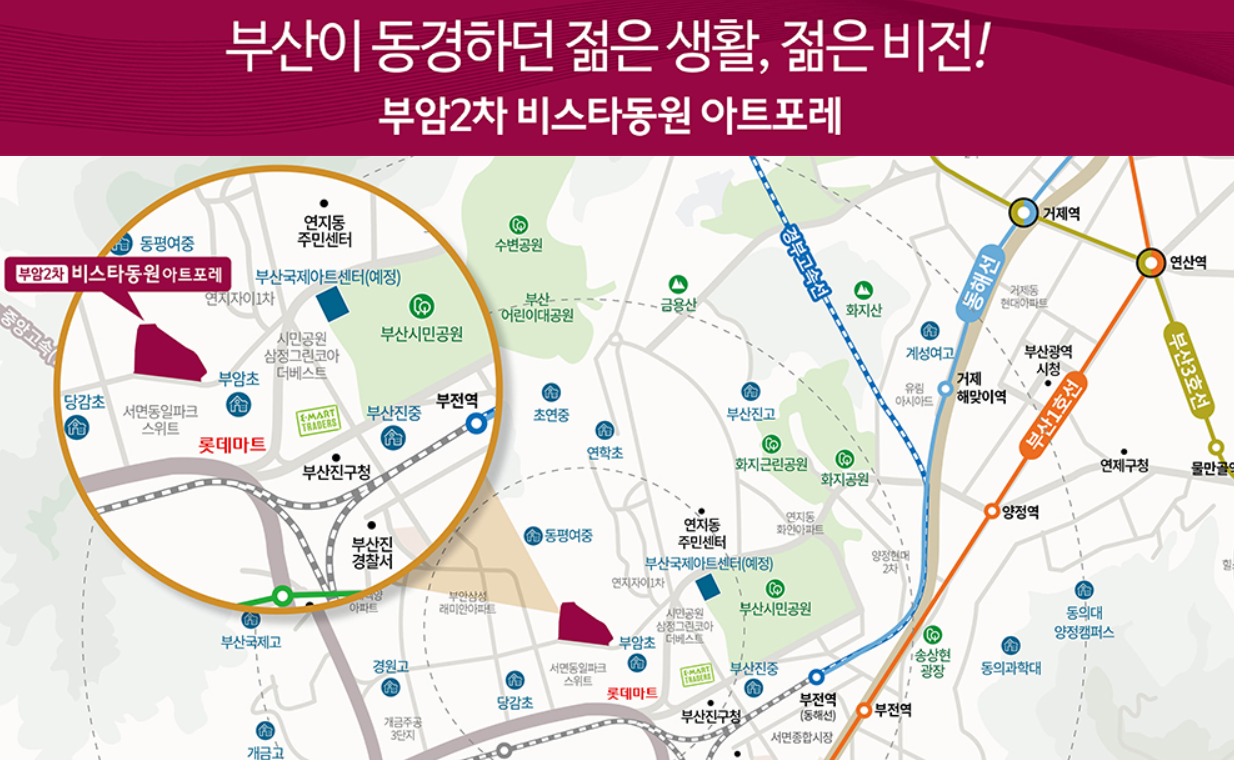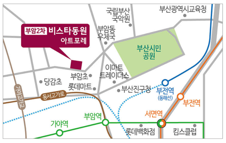 부암2차 비스타동원 아트포레는 부암동 일대 개발 호재와 범천 차량 기지 이전 예정으로 미래에 높은 프리미엄이 예상되는 단지 이기도 합니다. 서면 생활권 아파트로써 부암2차 비스타동원 아트포레 추천드립니다.