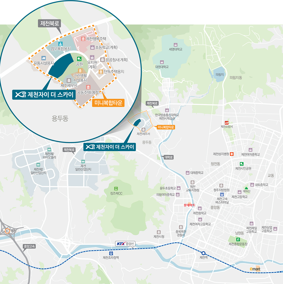 미니 복합타운, 제3일반산단, 제천 개발의 중심지에 위치합니다. 제천 자이 더 스카이은 제천 최고층 37층 초고층 특화 설계가 되었습니다. 미니 복합 타운내에 공공청사, 주거, 근린생활시설, 학교가 들어 섭니다.