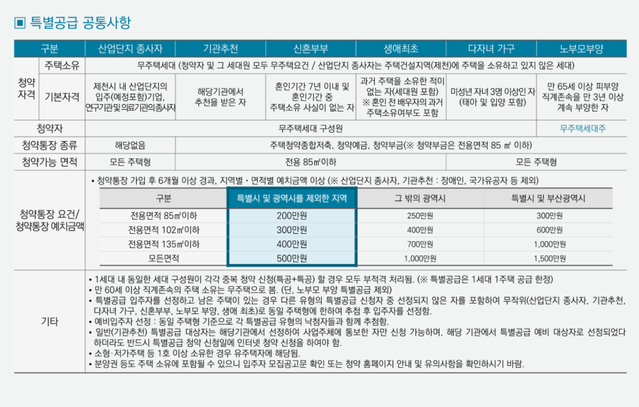 제천 자이 더 스카이 산업단지 종사자는 제천시 산업단지의 입주 기업 연구기관, 의료기관의 종사자가 청약 통장이 없어도 모든 주택형을 특별공급 신청 가능합니다.
