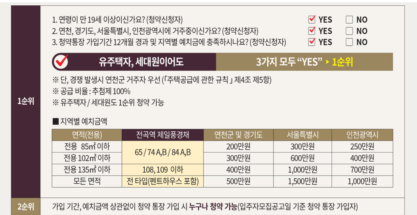 전곡역 제일풍경채 리버파크는 비규제 지역으로 세대주, 세대원 모두 청약이 가능합니다. 유주택자와 다주택자도 청약이 가능합니다. 청약 통장 가입시 누구나 2순위 청약이 가능합니다.