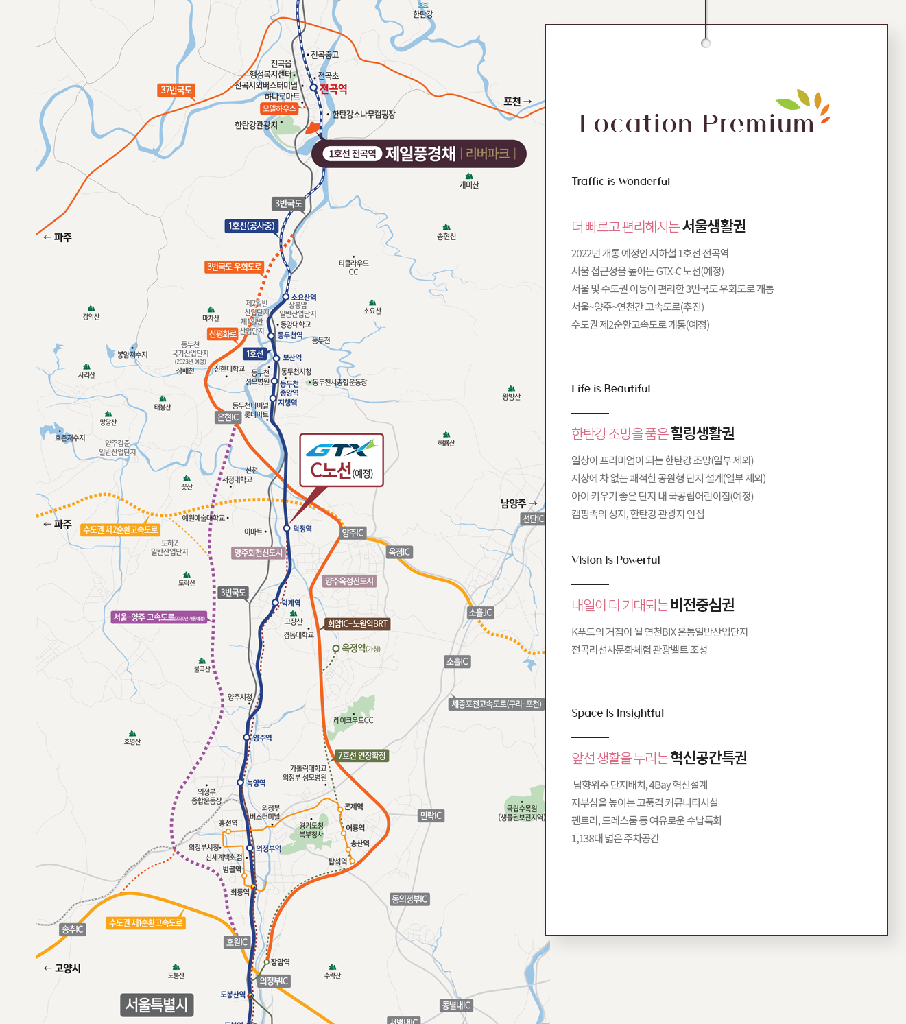 전곡역 제일풍경채 리버파크는 2022년 개통 예정인 지하철 전곡역에 위치합니다. 서울 접근성을 높여줄 GTX-C 노선도 예정되어 있습니다