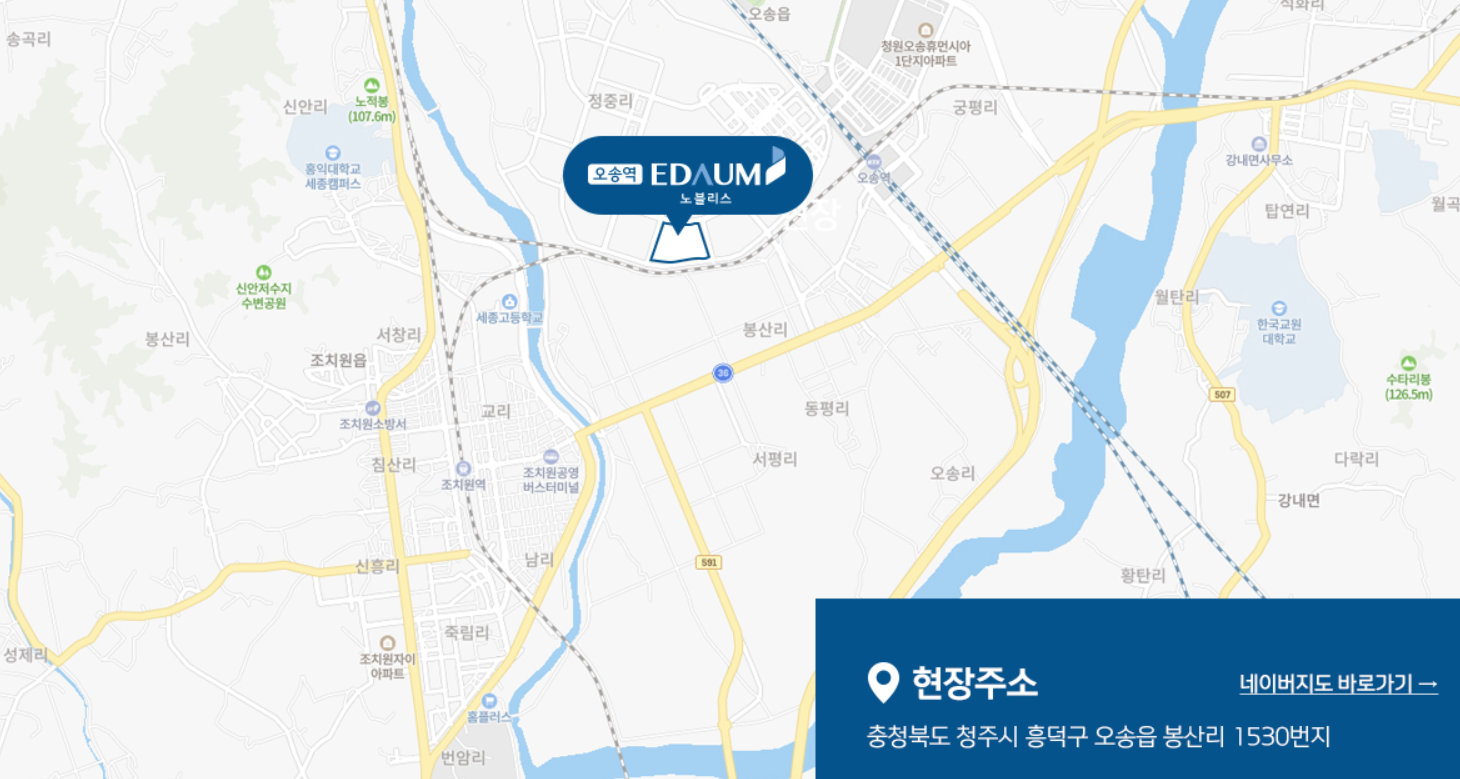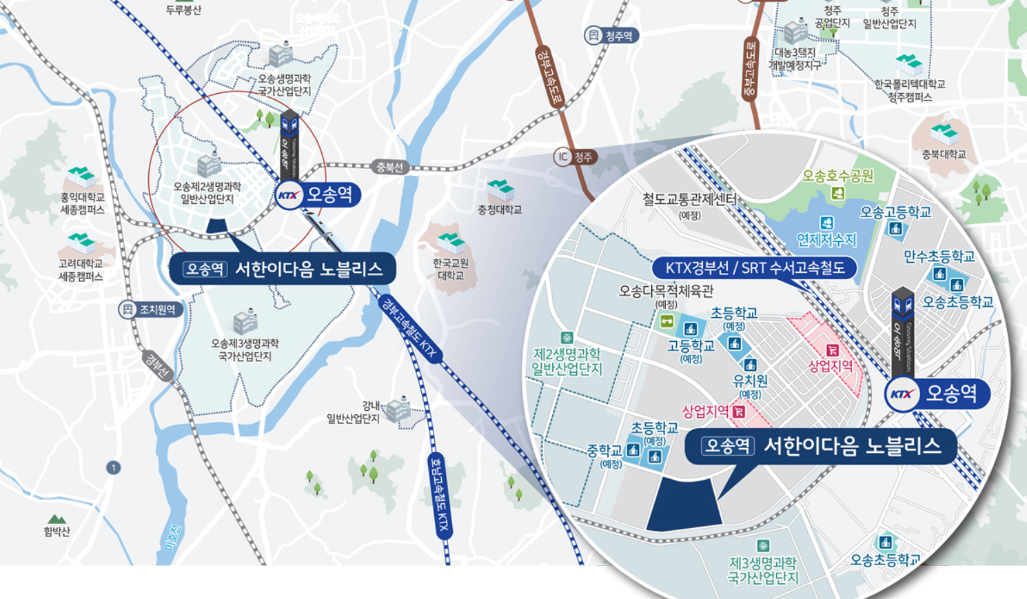 오송생명과학 국가산업단지, 오송제2생명과학 일반산업단지, 오송제3생명과학 국가산업단지 중심에 청주 오송역 이다음 노블리스가 들어섭니다. 홍익대학교 세종캠퍼스, 고려대학교 세종캠퍼스와도 인접합니다.