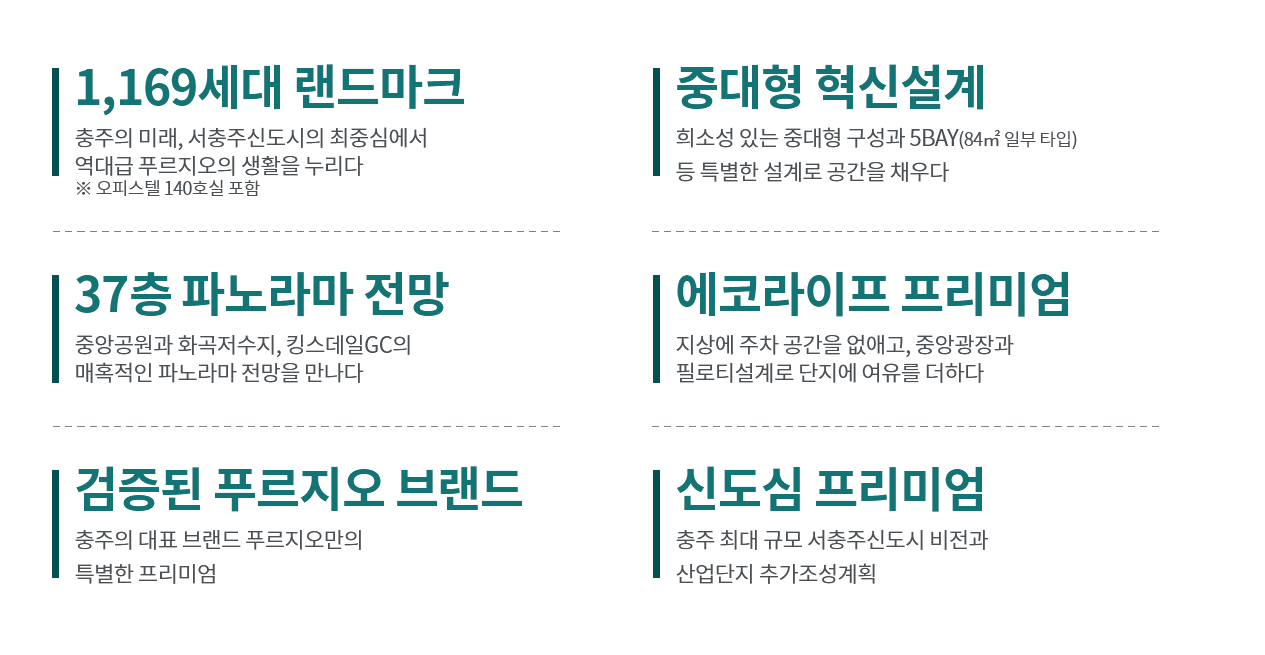 충주 대표 브랜드 푸르지오를 충주 주덕 화곡에서 만날 수 있습니다. 전매 제한이 없기때문제 비규제 지역 투자가 가능합니다. 서청주 신도시 최고 37층의 파노라마 전망을 만나볼 수 있습니다. 오피스텔까지 모두 1167세대 중대형 대단지로써 충주 대표 대단지가 될 것입니다. 단지 바로 앞에 중앙공원과 특급 인프라가 갖추어 나갈 예정입니다.