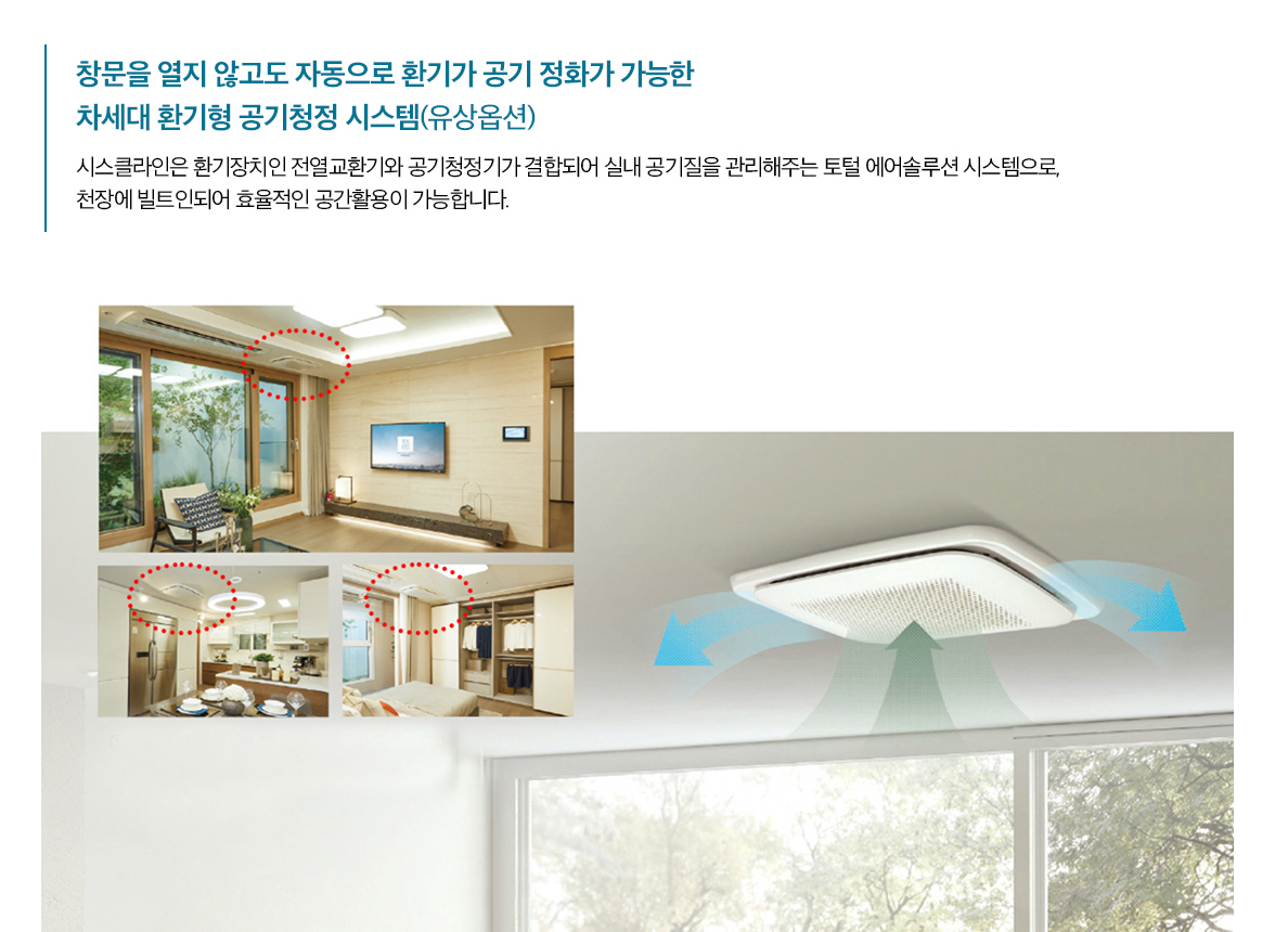 시스클라인은 창문을 열지 않고 자동으로 환기와 정화를 하는 차세대 환겨형 공기청정 시스템입니다. 유상옵션으로 시스클라인은 실내 공기질을 관리해주는 시스템으로 천장에 빌트인됩니다.