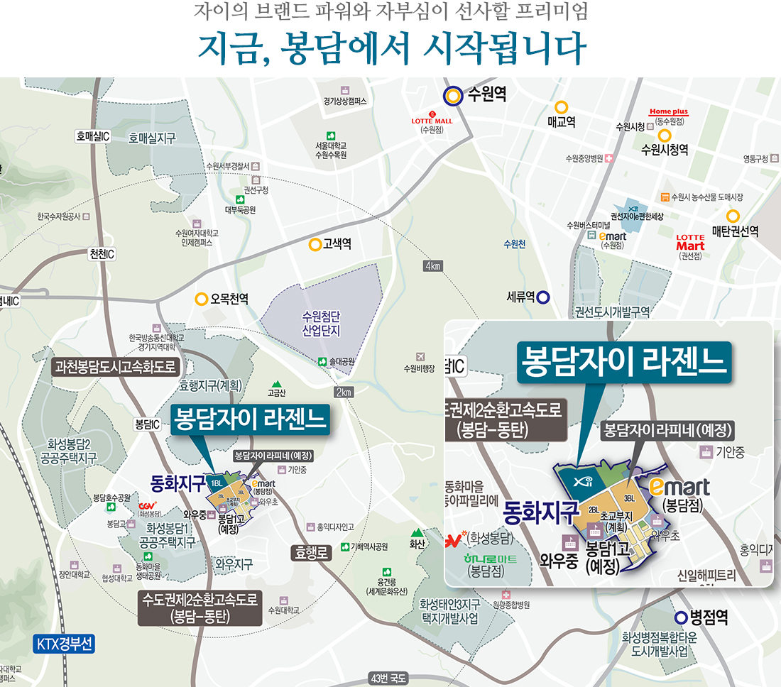 봉담 자이 라젠느는 서울권으로 서울과 빠르게 연결되는 쾌속 교통망을 여건으로 갖추고 있습니다. 봉담의 중심 동화지구 봉담 자이 라젠느는 수도권 어디든 빠르게 이동가능합니다. 수인 분당선 오목천역, 수도권제2순환고속도로를 통해 봉담과 동탄으로 빠르게 연결되어 있습니다.